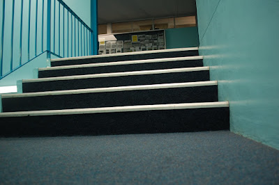 Analysis: The photo was taken from the Solomon stairs looking upwards towards the classroom. This gave the photo some leading lines and shows depth and 3D dimensional figures by placing the camera level to the start of the stairs. There aren't any shadows and the subject has the dark colours and this gave the composition a dank and gloomy feel. The focal point of the photo is the top of the stairs meeting the board outside of the classroom. This composition represents a Max Dupain style image through the dramatic dark feel that it has and the effective use of architecture of the stairs combined with the minimal shadows created from the sun outside. This is an important feature as it brightens the composition and contrasts the dark shadows. The image demonstrates the compositional rules and guidelines like "rule of thirds" and "30-60-10".